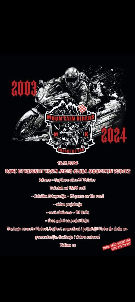 MK Mountain riders ove subote, 16. studenoga od 18h u prostoru kluba organizira Dan otvorenih vrata. Tom će prigodom biti postavljena izložba fotografija “21 years on the road”, a u videoprojekciji predstavljen njihov rad kroz proteklih 21 godinu u organizaciji raznih moto susreta, humanitarnih akcija i promicanju motociklističke kulture i zajedništva u lokalnoj zajednici. Za dobru atmosferu pobrinut će se DJ Brile u rock slušaoni, a za sve posjetitelje bit će pripremljen besplatni gulaš.