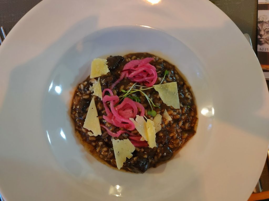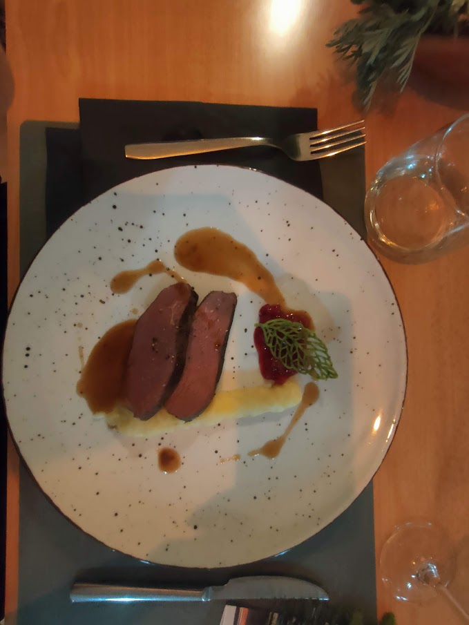 Večernji meni započeo je okruglicama dimljene pastrve, osvježene hrenom i salatom, savršeno uparenom s London Dry Ginom. Uslijedio je  rižot od medvjeda, oplemenjen domaćim sirom, lokalnim začinskim biljem, ukiseljenim  lukom i goranskim medunom. Jelo je bilo spojeno  s Pelinkovcem “Pelinova kći”. Nakon toga   ramstek jelena i goranske travarice, domaći krumpir s karameliziranim lukom i majčinom dušicom te džem od ribizla.