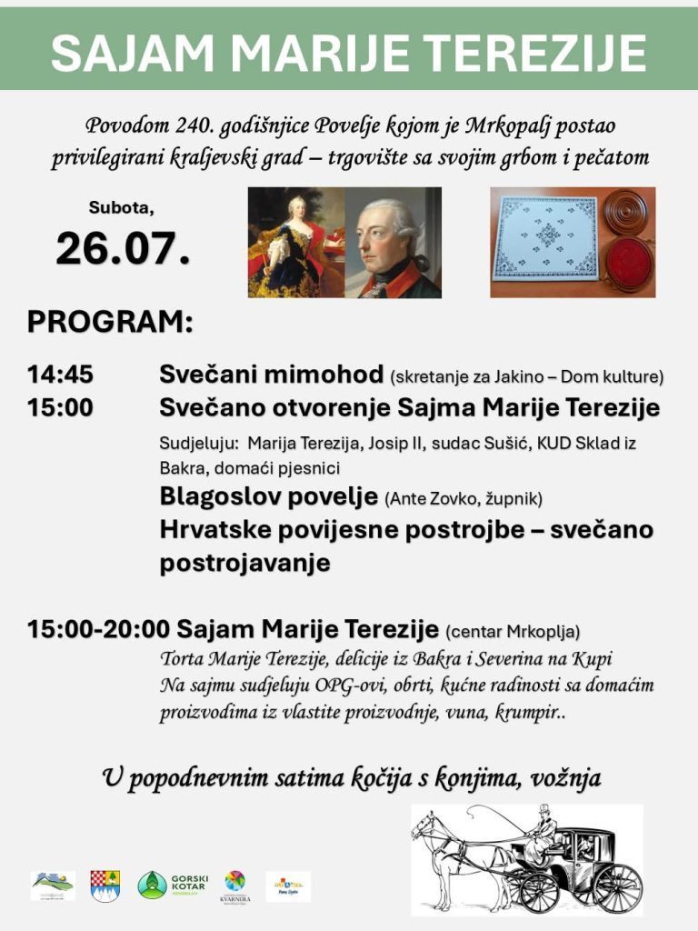 Povodom obilježavanja 240. godišnjice Povelje kojom je Mrkopalj stekao status privilegiranog kraljevskog grada- trgovišta sa vlastitim grbom i pečatom, ove subote Mrkopalj će oživjeti duh prošlosti kroz jedinstveni Sajam Marije Terezije.