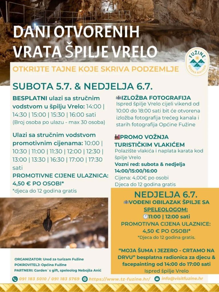 Dani špilje Vrelo održavaju se svake godine oko datuma kada je špilja otkrivena u srpnju 1950. godine. Ove godine u subotu i nedjelju, 5. i 6. srpnja organizatori iz Tourist Info Fužine pozivaju sve, od obitelji s djecom do planinara i radoznalih prolaznika da dođu doživjeti jedinstveno iskustvo i ljepotu podzemnog svijeta. Kroz špilju će posjetitelje voditi iskusni vodiči koji će podijeliti zanimljive priče i geološke činjenice o ovoj jedinstvenoj špilji koju često nazivaju “mala Postojna”. Pet termina s vodičem u subotu i u nedjelju od 14,00 do 16,00 sati za posjetitelje bit će besplatni.